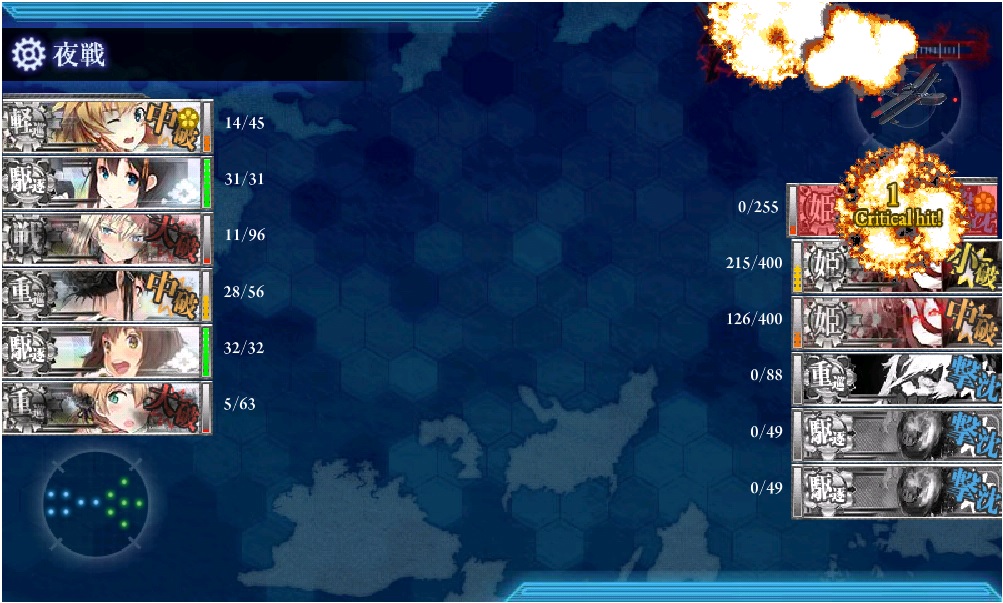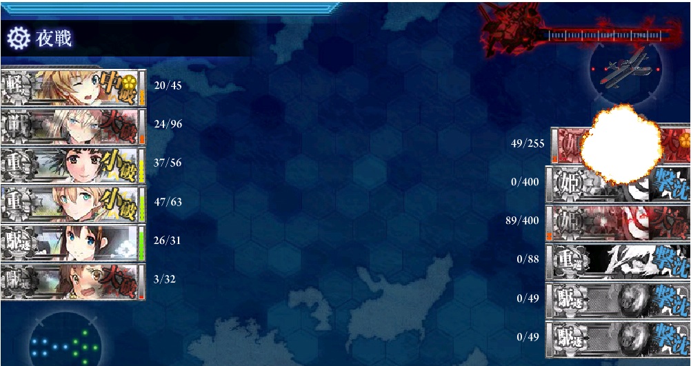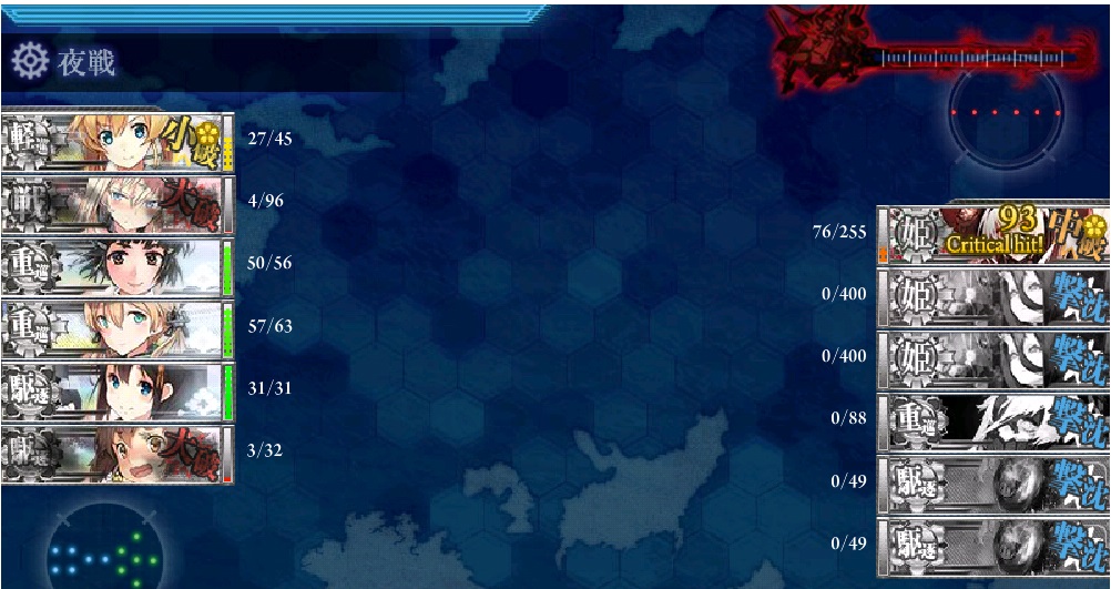 ⇒ボスの装甲は333あり、昼戦、夜戦ともに攻撃を行っても